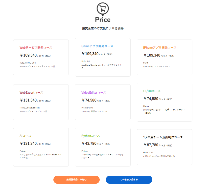 冒頭でも少し紹介した通り、受講費は約10万円とプログラミングスクールにしてはかなり安いです。