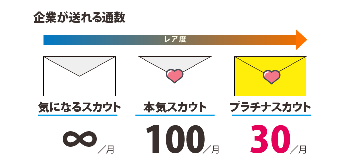 特にプラチナスカウトは月に30通しか送ることができないため、そのスカウトには送った学生に対する企業からの熱意が込められています。