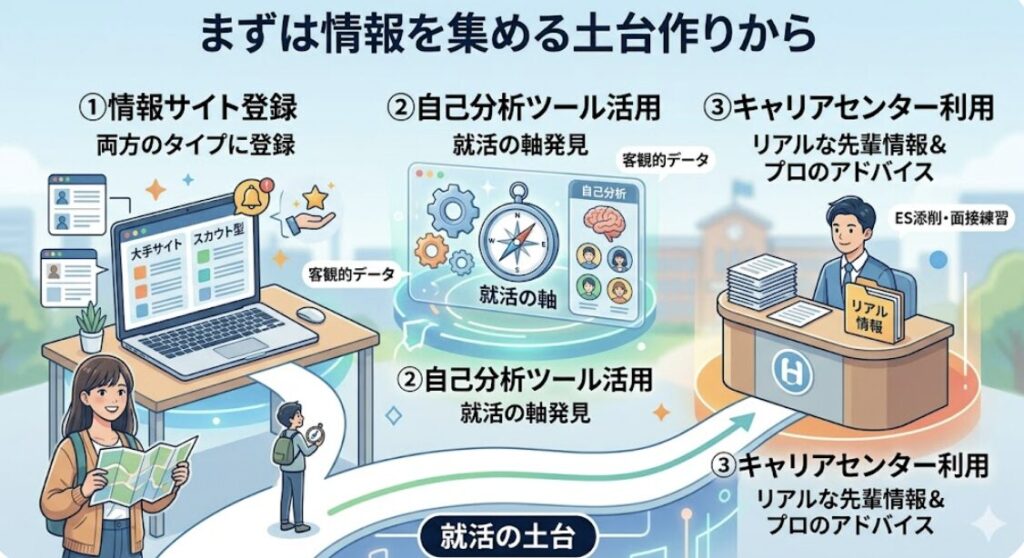 武器も地図も持たずに進もうとすると、焦りばかりが先行して空回りしてしまうからです。まずは以下の3つのステップで、土台作りから始めていければ、迷うことなくスムーズに就活を終えることができます。