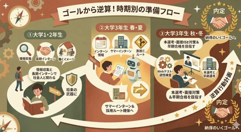 | 大学2年〜 | 長期インターンへの参加 | 実務経験を積み、スキルを磨く |