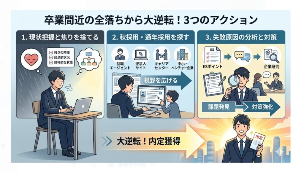 就活で全社不採用となり、持ち駒がゼロになると「このままどこにも就職できないのでは」と怖くなりますよね。