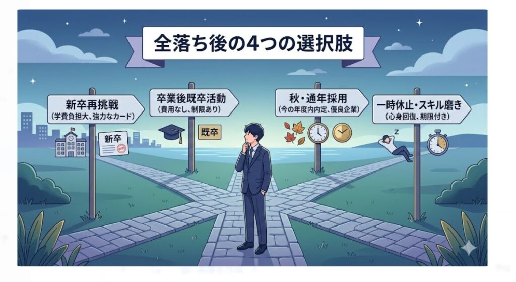 全部落ちたという事態に直面したとき、どの道に進むべきか迷ってしまいますよね。