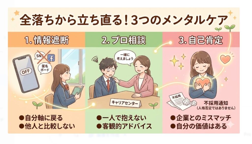 全部落ちて心が疲れ切ってしまったなら、無理に活動を続けず、一度心身を休める期間を作ることも大切です。